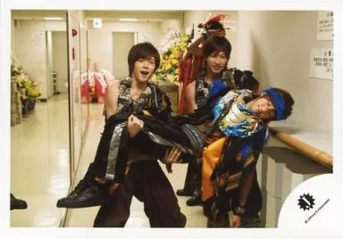 Japanese title: 生写真(ジャニーズ)/アイドル/ジャニーズJr. ジャニーズJr./林翔太・江田剛・安井謙太郎/横型・全身・両手安井抱え・口開け・廊下/「ANOTHER」楽屋撮影オフショット/公式生写真