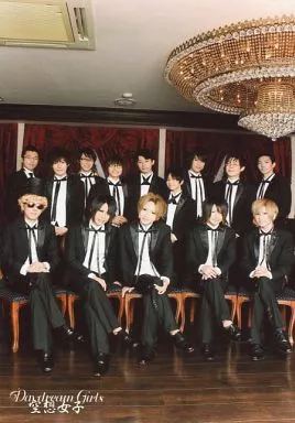 Japanese title: 生写真(男性)/ヴィジュアル系バンド/執事歌劇団 アンティック-珈琲店-×執事歌劇団/集合(14人)/横型・全身・衣装黒・足組み/Daydream Girls 空想女子