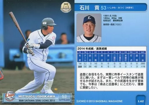Japanese title: BBM/レギュラーカード/BBM2015 埼玉西武ライオンズ L62 [レギュラーカード] : 石川貢