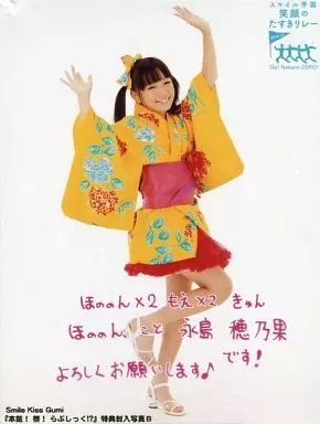 Japanese title: 生写真(女性)/アイドル/スマイル学園 スマイル学園(Smile Kiss Gumi)/永島穂乃果/全身・浴衣黄・帯赤・印刷メッセージ入り/Smile Kiss Gumi 『本気!祭!らぶしっく!?』特典封入写真B