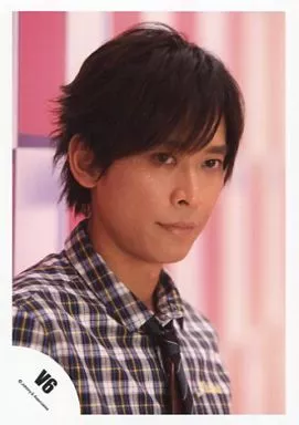 Japanese title: 生写真(ジャニーズ)/アイドル/V6 V6/坂本昌行/バストアップ・チャック柄シャツ・右向き・口閉じ・背景赤/公式生写真