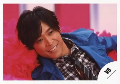 Japanese title: 生写真(ジャニーズ)/アイドル/V6 V6/坂本昌行/横型・バストアップ・ジャケット青・チェック柄シャツ・歯見せ・背景赤/公式生写真