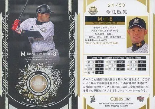 Japanese title: BBM/レギュラーカード/千葉ロッテマリーンズ/BBM2015 ベースボールカードプレミアム ジェネシス 032[レギュラーカード]:今江敏晃(ホロ箔パラレル版)(/50)