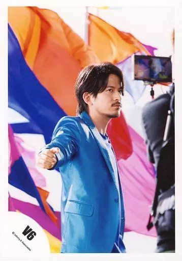 Japanese title: 生写真(ジャニーズ)/アイドル/V6 V6/岡田准一/上半身・衣装青.水色・右手上げ・右向き・カメラマン・後ろに旗/公式生写真