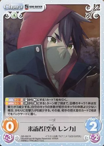 Japanese title: カオス/R/Chara/風/ブースターパック「GOD EATER 5th ANNIVERSARY EDITION」 GE-002[R]:来訪者「空木 レンカ」