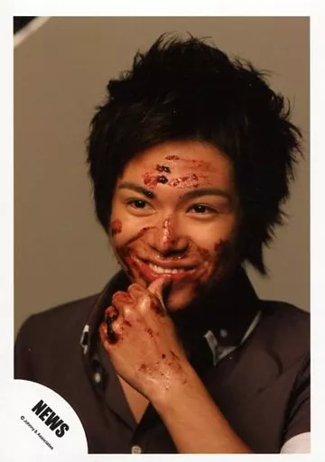 Japanese title: 生写真(ジャニーズ)/アイドル/NEWS NEWS/加藤シゲアキ/バストアップ・衣装茶・顔汚れ・左手親指唇・歯見せ・背景グレー/公式生写真