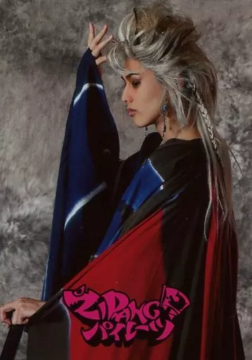 Japanese title: 生写真(男性)/俳優 前内孝文/上半身・衣装青・赤・左向き・右手上げ・背景グレー・キャラクターショット/舞台「ZIPANGパイレーツ」
