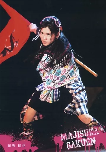 Japanese title: 生写真(AKB48・SKE48)/アイドル/AKB48 田野優花(ガッツ)/ライブフォト・全身・両手旗・衣装チェック柄・キャラクターショット/DVD・Blu-ray『舞台「マジすか学園」~京都・血風修学旅行~』封入特典生写真
