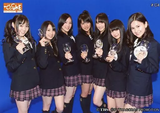 Japanese title: 生写真(AKB48・SKE48)/アイドル/SKE48 #C4:SKE48/集合(7人)/横型・膝上・衣装黒・チェックスカート・グラス・背景青/DVD「でらSKE~夜明け前の国盗り48番勝負」特典生写真