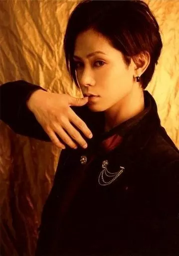 Japanese title: 生写真(男性)/俳優 玉城裕規/上半身・衣装黒・赤・右手口元・左向き・背景黄色・キャラクターショット/イベント「メサイア-琥珀ノ章-」