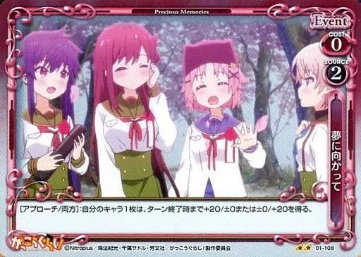 Japanese title: プレシャスメモリーズ/UC/イベント/赤/がっこうぐらし! ブースターパック 01-108[UC]:(ホロ)夢に向かって