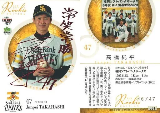 BBM / Regular Card / Fukuoka Soft Bank Hawks / BBM2016 RookIe Edition 001 [Regular Card] : Junpei Takahashi (Red hot stamping with signature) (/ 47)