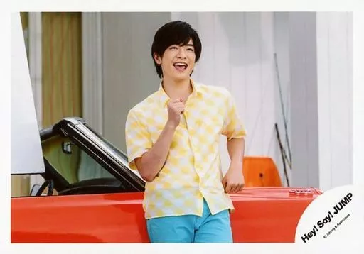 Japanese title: 生写真(ジャニーズ)/アイドル/Hey! Say! JUMP Hey! Say! JUMP/知念侑李/横型・膝上・シャツ黄白チェック柄・ズボン青緑・両手グー・口開き・目線上・背景車赤/「キラキラ光れ」 PV撮影オフショット/公式生写真