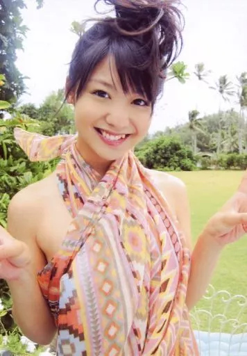 Japanese title: 生写真(女性)/女優 小池唯/上半身・衣装オレンジ水色黄茶・両手ピース見切れ・歯見せ・背景野外/写真集「scene2」発売記念イベント特典生写真