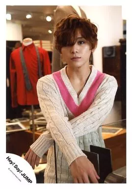 Japanese title: 生写真(ジャニーズ)/アイドル/Hey! Say! JUMP Hey! Say! JUMP/山田涼介/上半身・ベージュ・ピンク・セーター・両手交差・背景赤シャツ/公式生写真
