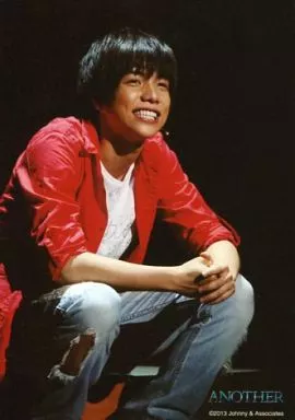 Japanese title: 生写真(ジャニーズ)/アイドル/7WEST 7WEST/重岡大毅/ライブフォト・全身・座り・衣装赤白・両手組み・背景黒/ANOTHER 2013