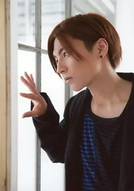 Japanese title: 生写真(男性)/俳優 宮崎秋人(新開隼人)/バストアップ・衣装黒.青・ボーダー柄・右手窓・私服ショット/舞台「『弱虫ペダル』箱根学園篇~野獣覚醒~」ブロマイド