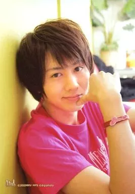 Japanese title: 生写真(男性)/俳優 太田基裕/バストアップ・Tシャツピンク・右手グー・右向き・背景白/『メモ・リアル』the PARTY!