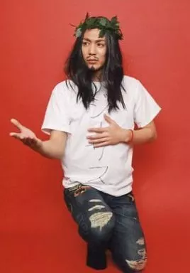 Official photo (male) / actor Ryuko Isogai / Whole Body / Squatting / T-Shirt White "Jesus" / Left Hand Breast / Background Red / Christmas Event / Official Official photo