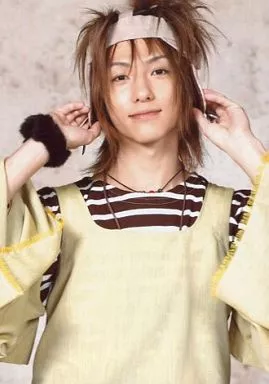 Japanese title: 生写真(男性)/歌手 鈴木拡樹(ジャン)/上半身・衣装黄色・両手耳・背景ベージュ/舞台「ROMEO-午前0時の訪問者-」