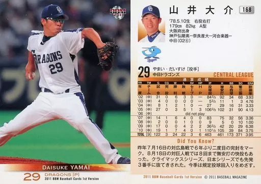 BBM / Regular / Chunichi Dragons / BBM2011 Baseball Card 1 st Version 168 [Regular] : Daisuke Yamai
