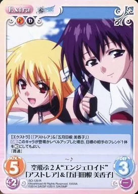 Japanese title: カオス/R/Extra/火闇/ブースターパック そらのおとしものFinal 永遠の私の鳥籠&劇場版そらのおとしもの 時計じかけの哀女神 SO-120[R]:空飛ぶ2人“エンジェロイド”「アストレア」&「五月田根 美香子」