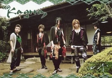 Japanese title: 生写真(男性)/ヴィジュアル系ロックバンド/Kagrra Kagrra/集合(5人)/横型・全身・衣装黒・背景建物・「四季」/公式生写真