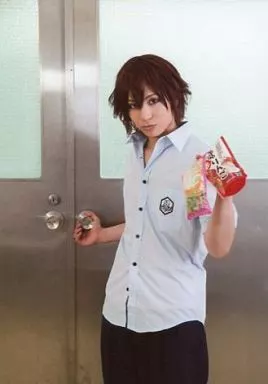 Japanese title: 生写真(男性)/俳優 宮崎秋人(新開隼人)/膝上・衣装制服・左手お菓子・右手ドアノブ・キャラクターショット/舞台『弱虫ペダル』 インターハイ篇 The First Result ブロマイド