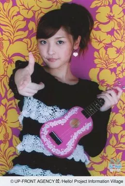 Japanese title: 生写真(ハロプロ)/アイドル/モーニング娘。 モーニング娘。/石川梨華/上半身・衣装黒・左手ウクレレ・右手指差し・背景紫黄色・ポストカードサイズ/Alo-Hello