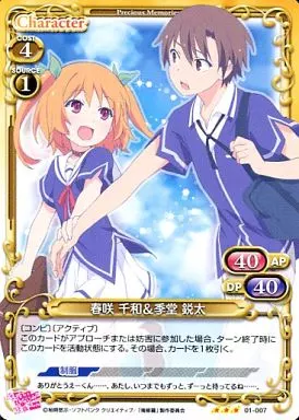 Japanese title: プレシャスメモリーズ/R/キャラクター/黄/俺の彼女と幼なじみが修羅場すぎる ブースターパック 01-007[R]:春咲 千和&季堂 鋭太