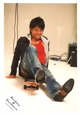 Japanese title: 生写真(ジャニーズ)/アイドル/タッキー&翼 タッキー&翼/今井翼/全身・座り・スケボー・衣装黒・インナー赤・笑顔/公式生写真