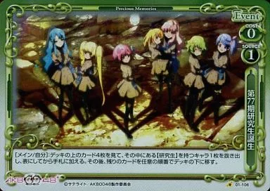 Japanese title: プレシャスメモリーズ/C/イベント/緑/AKB0048 ブースターパック 01-106[C]:(ホロ)第77期研究生誕生