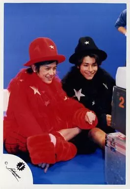 Japanese title: 生写真(ジャニーズ)/アイドル/ジャニーズ ジャニーズ/秋山純・滝沢秀明/全身・座り・滝沢衣装赤・帽子・ジミー衣装黒・背景青