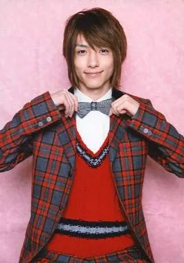 Official photo (male) / actor Hiroki Suzuki / Upper body and jacket check gray red, inner red, two handed bow tie, background pink, postcard size / official Official photo