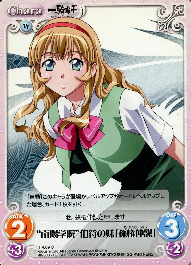 Japanese title: カオス/C/Chara/水/ブースターパック 「OS:一騎当千 1.00」 IT-009[C]:”南陽学院”伯符の妹「孫権仲謀」