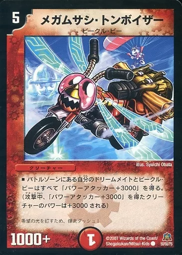 Japanese title: デュエルマスターズ/C/火/クリーチャー/ビークル・ビー/[DM-23]不死鳥編 第5弾 冥龍王帰還(ジ・エンド・オブ・ユニバース) 50/55/Y5[C]:メガムサシ・トンボイザー