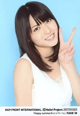Japanese title: 生写真(ハロプロ)/アイドル/°C-ute °C-ute/矢島舞美/バストアップ・衣装白・体右向き・左手ピース・背景水色/「Happy summerキャンペーン」特典第1弾