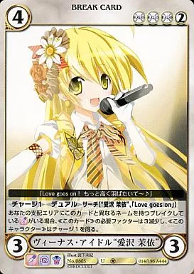 Japanese title: アクエリアンエイジオルタナティブ/U/E.G.O./エクスパンション 第4弾 金色の閃姫 No.0605[U]:ヴィーナス・アイドル”愛沢 茉依”