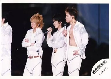 Official photo (Johnnys) / idol / V6 V6 / Morita, Okada, Sakamoto / Live Photo, Above the Knee, Costume White, Background Black, Left Hand Waist, Right Hand Microphone, Logo "J-Friends" / Official Official photo