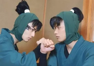 Japanese title: 生写真(男性)/俳優 山口賢貴(潮江文次郎)・前内孝文(食満留三郎)/横型・バストアップ・衣装緑・グー・腕合わせ/ミュージカル「忍たま乱太郎」 第二弾「予算会議でモメてます!」