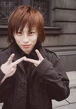 Japanese title: 生写真(男性)/アイドル/w-inds. w-inds/千葉涼平/バストアップ・衣装黒・背景壁・両手ピース