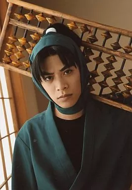 Japanese title: 生写真(男性)/俳優 山口賢貴(潮江文次郎)/上半身・肩にそろばん・衣装緑・背景障子・キャラクターショット/ミュージカル忍たま乱太郎 第一弾「がんばれ六年生!」 再演