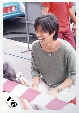 Japanese title: 生写真(ジャニーズ)/アイドル/V6 V6/井ノ原快彦/膝上・衣装灰色・ネックレス青・座り・両手膝上・背景屋外/公式生写真