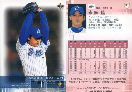 BBM / Regular Card / BBM2003 Baseball Card 1 st 157 : Takashi Saito "Yokohama BayStars"