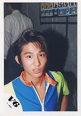 Japanese title: 生写真(ジャニーズ)/アイドル/V6 V6/三宅健/バストアップ/青、黄緑服/背景人