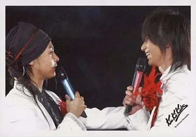 Japanese title: 生写真(ジャニーズ)/アイドル/KinKi Kids KinKi Kids/堂本剛・堂本光一/横型/バストアップ/衣装白/向かい合わせ/マイク/背景黒/公式生写真