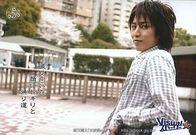Japanese title: 生写真(男性)/俳優 鎌苅健太/上半身/横型/衣装灰色/手すりによりかかり/Visualストーリー「水族館deデート」