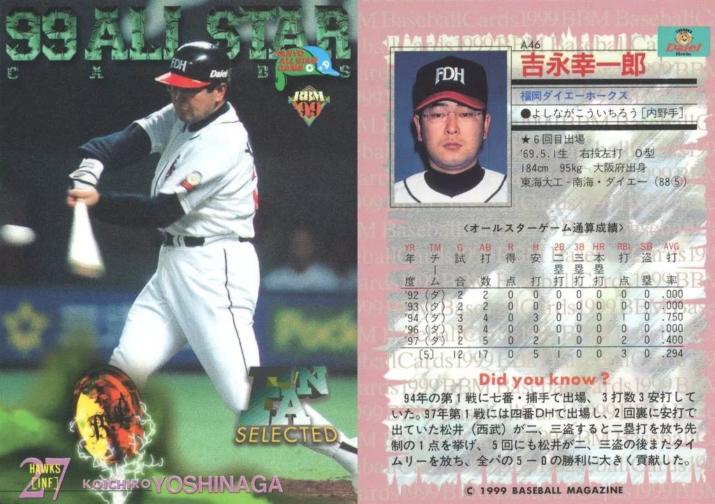 BBM / All-Star Card / BBM99 Baseball Card A46 : Koichiro Yoshinaga "Fukuoka Daiei Hawks"