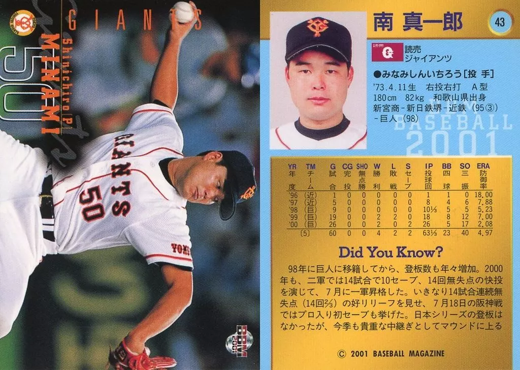 BBM / Regular Card / BBM2001 Baseball Card 43 : Shinichiro Minami "Yomiuri Giants"
