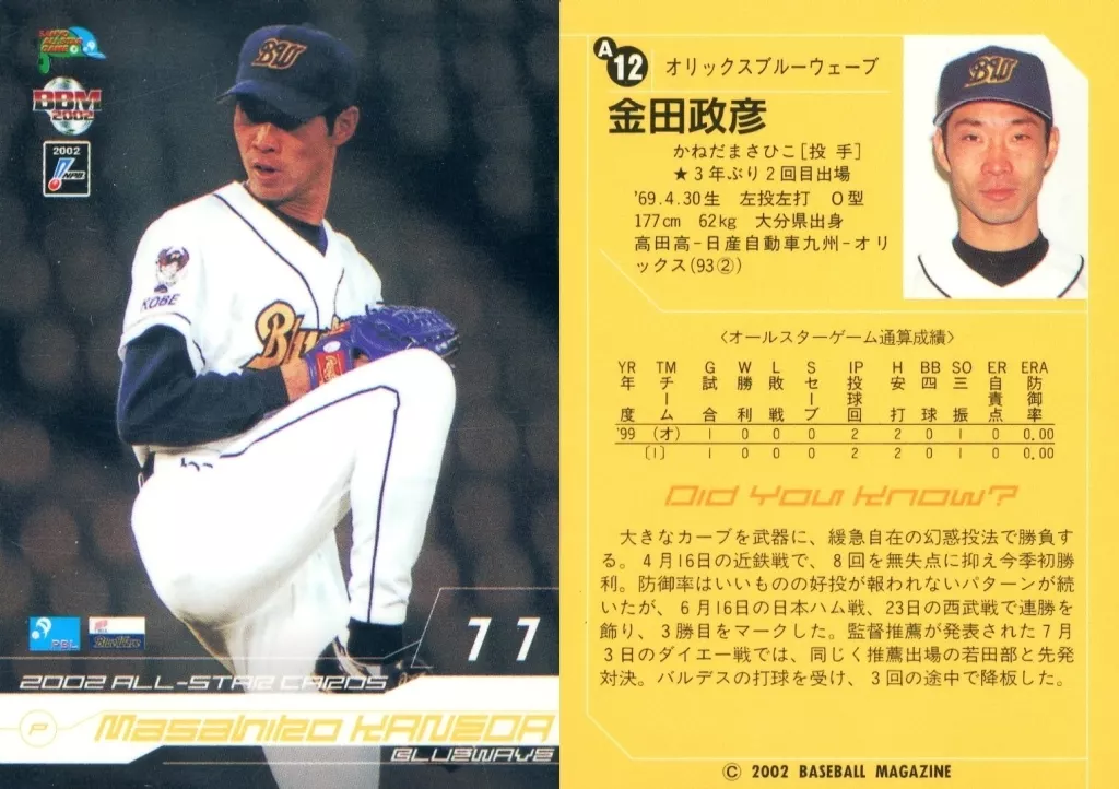 Japanese title: BBM/オールスターカード/BBM2002ベースボールカード A12:金田政彦「オリックスバファローズ」